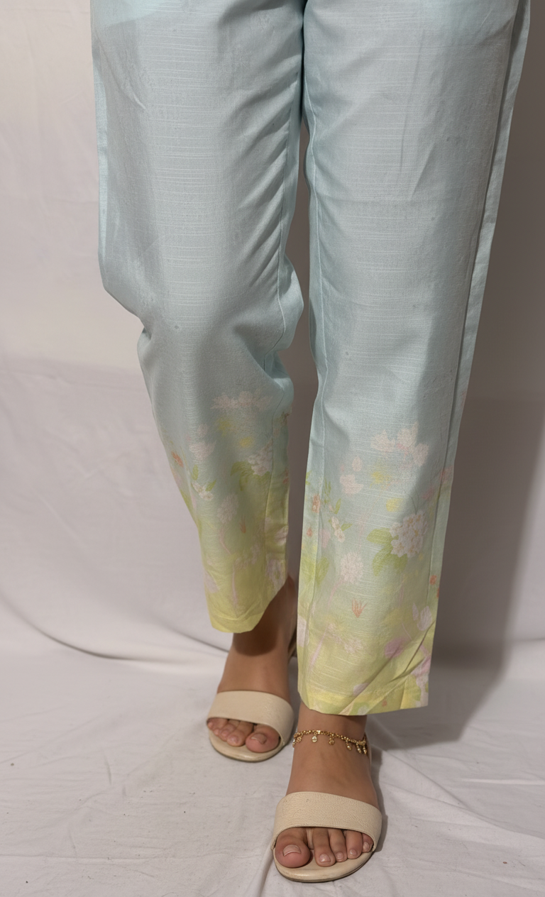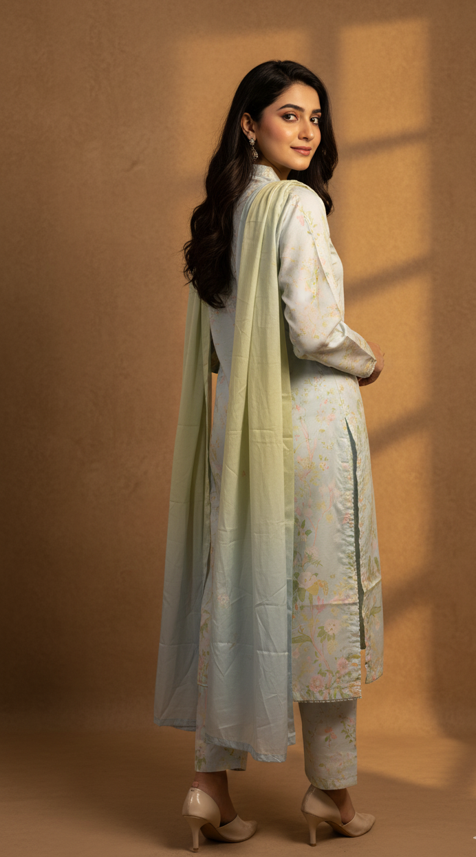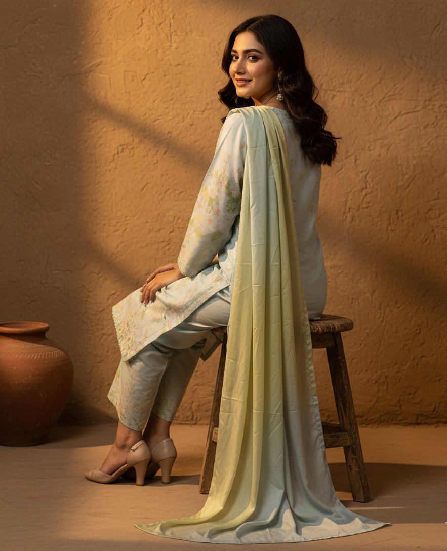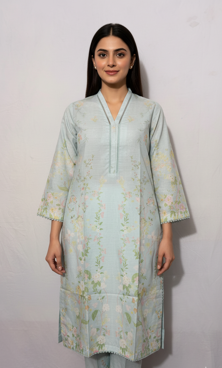 The elegant kameez boasts fine threadwork along the neckline, acting as your requested embellishment. Consequently, this detailed work, often mimicking embroidery, provides a refined, textural focal point that elevates the entire printed ensemble.
